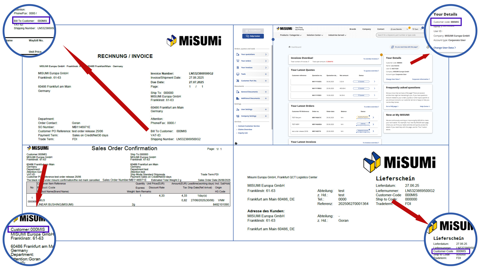Die Kundennummer heißt bei MISUMI Customer Code, besteht aus 6 Zeichen und in den meisten Fällen aus Ziffern und Buchstaben. MISUMI-Customer Codes sind immer unternehmensgebunden, nicht usergebunden.