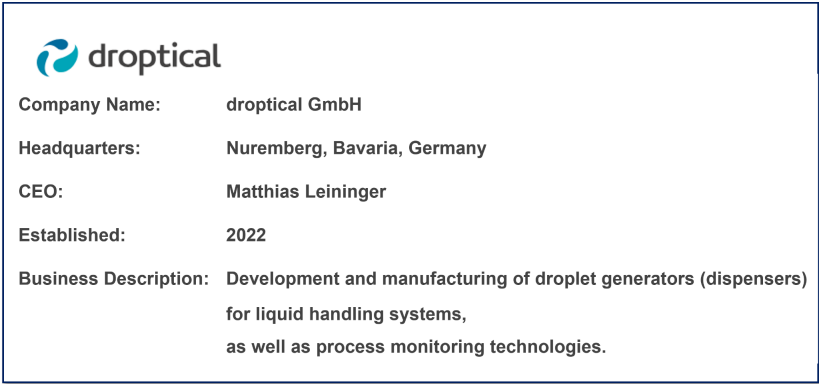 Herr Leininger: Die droptical GmbH mit Sitz in Nürnberg, Deutschland, hat es sich zur Aufgabe gemacht, das Liquid Handling* durch innovative Technologie zu revolutionieren. Unser Unternehmen begann mit einer einfachen, aber wirkungsvollen Idee: Kombination präziser Tröpfchenerzeugung mit fortschrittlichen Kamerasystemen zur Überwachung und Steuerung von Dosierprozessen in Echtzeit.